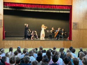 Sur scène, le violon d’Isabelle Meyer, entourée des musiciens de l’Ensemble Art-en-Ciel, a emmené les enfants dans un voyage musical à travers différents pays d’Europe. Les danseurs de break dance ont accompagné la musique avec des acrobaties impressionnantes et très appréciées.